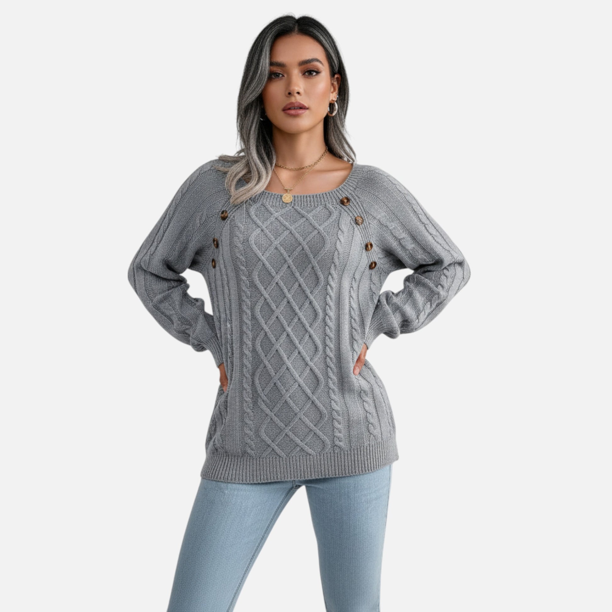 Your seasonal staple deserves both beauty and practicality — and this piece delivers both. The button detailing along the neckline adds a charming touch of vintage sophistication, while the gentle elasticity ensures lasting comfort throughout the day. Pair it with tailored trousers or a wool skirt to create an ensemble that radiates refined femininity and quiet confidence. With its balance of warmth, versatility, and timeless design, this sweater is the epitome of modern classic style.