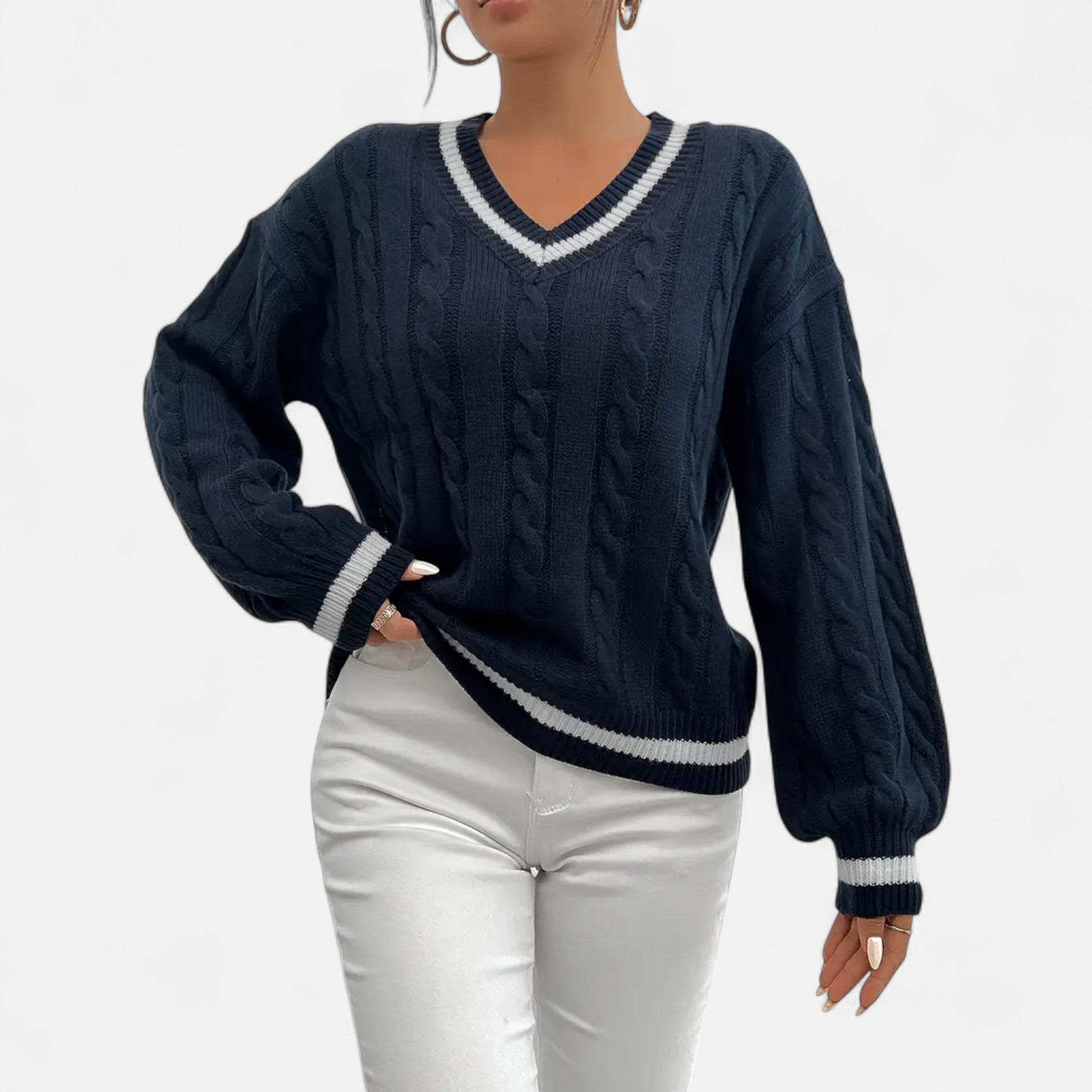 Riveromode presents a sweater that embodies timeless elegance through its classic cable knit design. The V-neckline and refined white trim lend a touch of distinction, while the drop shoulder sleeves and soft knit create a look that feels both effortless and polished. Imagine wrapping yourself in a piece that captures heritage charm with modern ease.