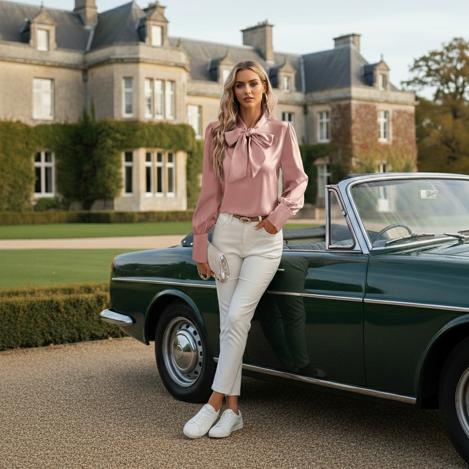 Riveromode presents a blouse that redefines timeless femininity. Crafted in smooth satin with a refined bow tie neck, this piece embodies quiet luxury. Imagine your wardrobe elevated with a blouse that transitions seamlessly from the elegance of the office to the charm of evening gatherings, always leaving an impression of effortless grace.